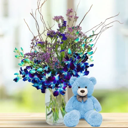 Lilies, Roses, Alstroemeria, and Hydrangeas in Vase with Cake
